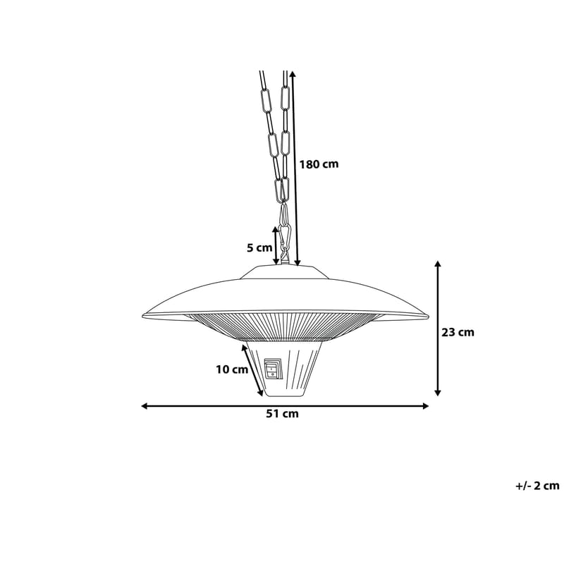 Snygg terassvärmare. Modern design och effektivitet kombineras i denna eleganta terrassvärmare. Lägg till lite skön värme till din uteplats på ett snabbt och effektivt sätt. För att sätta upp värmaren monterar du bara kroken i taket eller på någon annan plats som inte är tillgänglig för barn och hänger upp enheten. Den infraröda värmemekanismen sprider värmen direkt och ger en känsla som liknar exponering för solen. Njut av svala sommarkvällar till fullo med den elektriska värmaren.