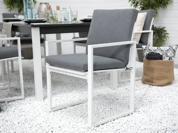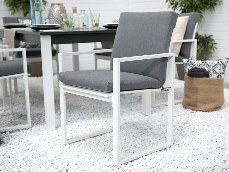 Trädgårdsset bestående av ett hopfällbart trädgårdsbord och 6 praktiska stolar. Njut av dina eftermiddagsmåltider och utomhusfester med dina vänner tack vare denna matgrupp för trädgården. Den är tillverkad av slitstarkt allvädersaluminium och är UV-beständig så att den inte tappar färg när den utsätts för solljus. Den utdragbara bordsskivan kan enkelt rymma dina gäster medan de tjockt stoppade dynorna på stolarna garanterar bästa möjliga sittkomfort. Uppsättningen fungerar utmärkt med alla moderna eller moderna utomhusutrymmen och ger en industriell touch till alla miljöer.